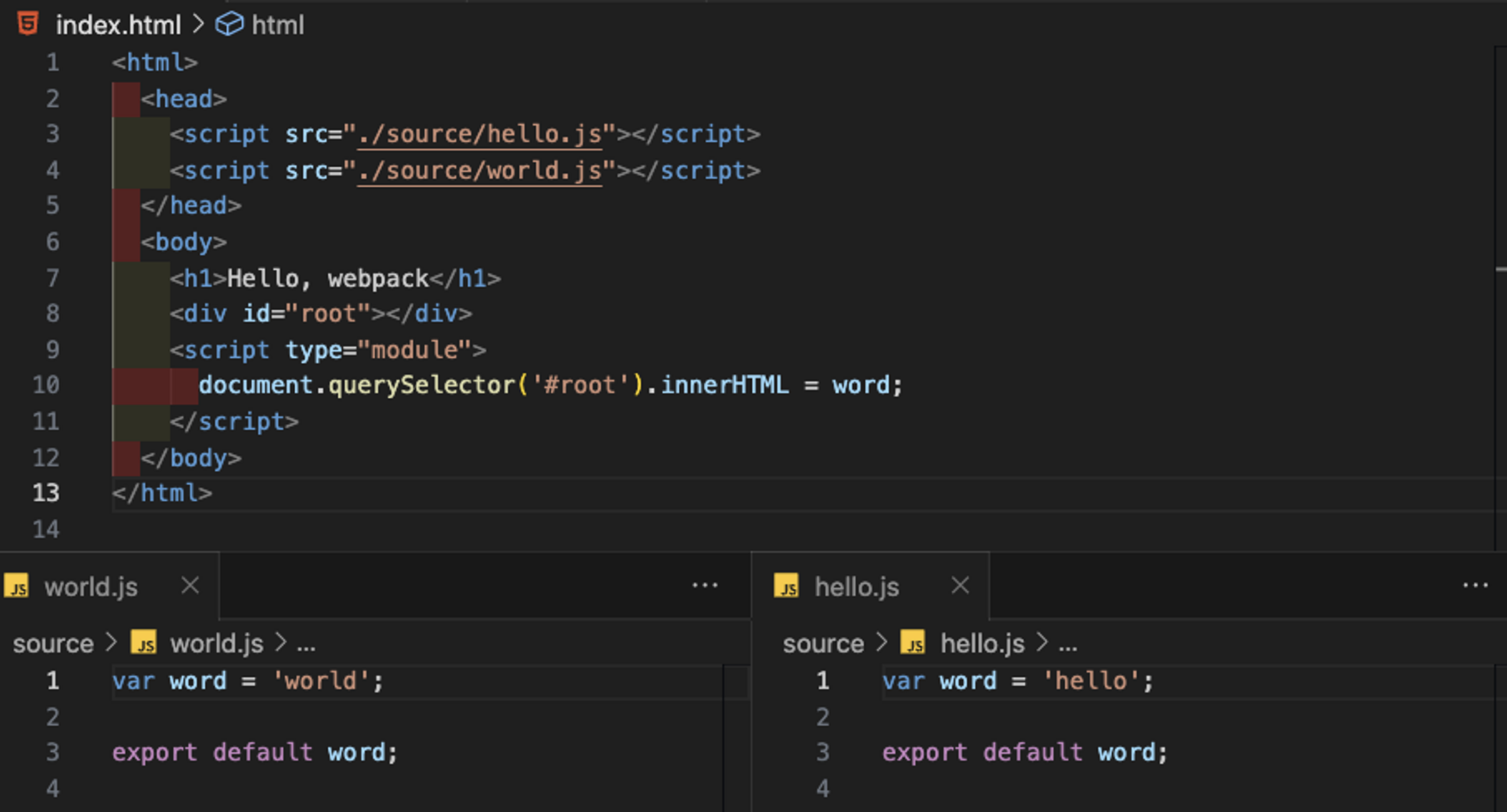 hellow.js에도 word 가 있고 world.js에도 word가 있어서 결국 가장 늦게 선언된 script로 덮어쓰기 되면서 word라는 단어는 ‘world’ 가 된다.