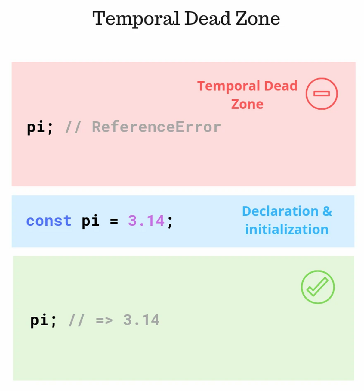 이 일시적인 사각지대는 스코프의 시작 지점부터 초기화 시작 지점까지의 구간을 TDZ(Temporal Dead Zone) 라고합니다.