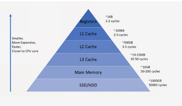 - 캐시(Cache)는 비싸다. 메모리 저장공간은 속도가 빠를수록 용량이 적고, 가격이 높다.