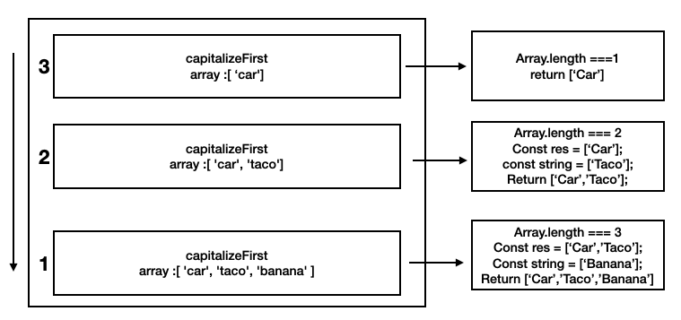 배열안에 각각의 string 중에서 첫번째 문자열을 추출한다. 추출한 문자열을 대문자로 바꿔야 하는데 toUpperCase() 메서드를 이용해서 대문자로 변경할 것이다. 나머지 문자열은 substr()메서드를 이용해서 받아올 예정이다. 반복되는 과정은 재귀함수로 나타낼건데, 말로는 표현이 어려워 그림으로 표현할 예정이다.