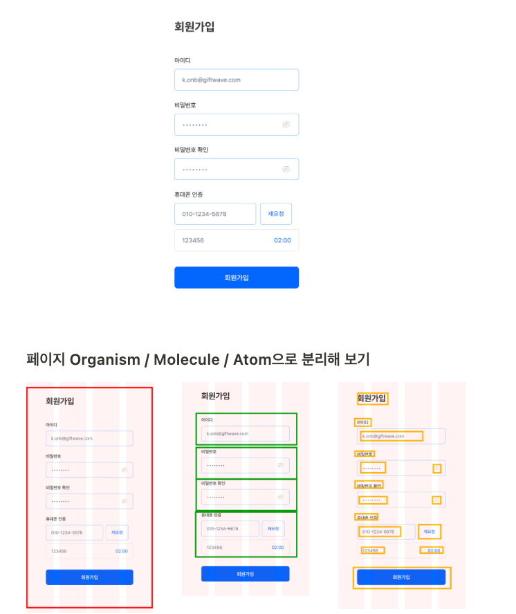 컴포넌트의 복잡성이나 크기로만 생각한다면 휴대폰 인증 영역은 Organism이 아닌 Molecule로 들어갈 수 있다. 그렇기에 나는 처음에 이것을 Molecule로 지정했었다.