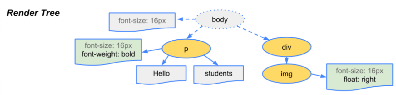 렌더트리를 만드는 과정에선, 각 요소들의 스타일이 계산되고 또 이 계산되는 과정에서 다른요소들의 스타일 속성들을 참조합니다.