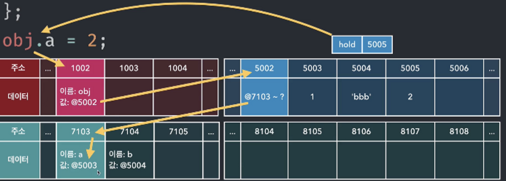 정리해보자면, obj에 대한 주소값 @5002는 변하지 않는다. @5002의 값인 @7103~ 값들이 바뀌는 것이다.